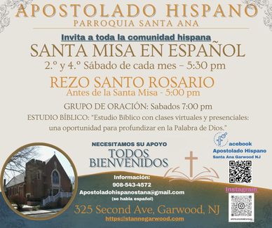 The Church of Saint Anne in Garwood, will be offering a Spanish Mass and Spanish Bible study. The masses will start in December, on the second and fourth Saturday of the month at 5:30PM. We will have Spanish Bible study the first and third Sunday of the month starting at 2PM. These services are being offered after contacting numerous parishes and determining a potential need within our community. The Newark Archdiocese is aware of our efforts and may endorse it to a weekly event.