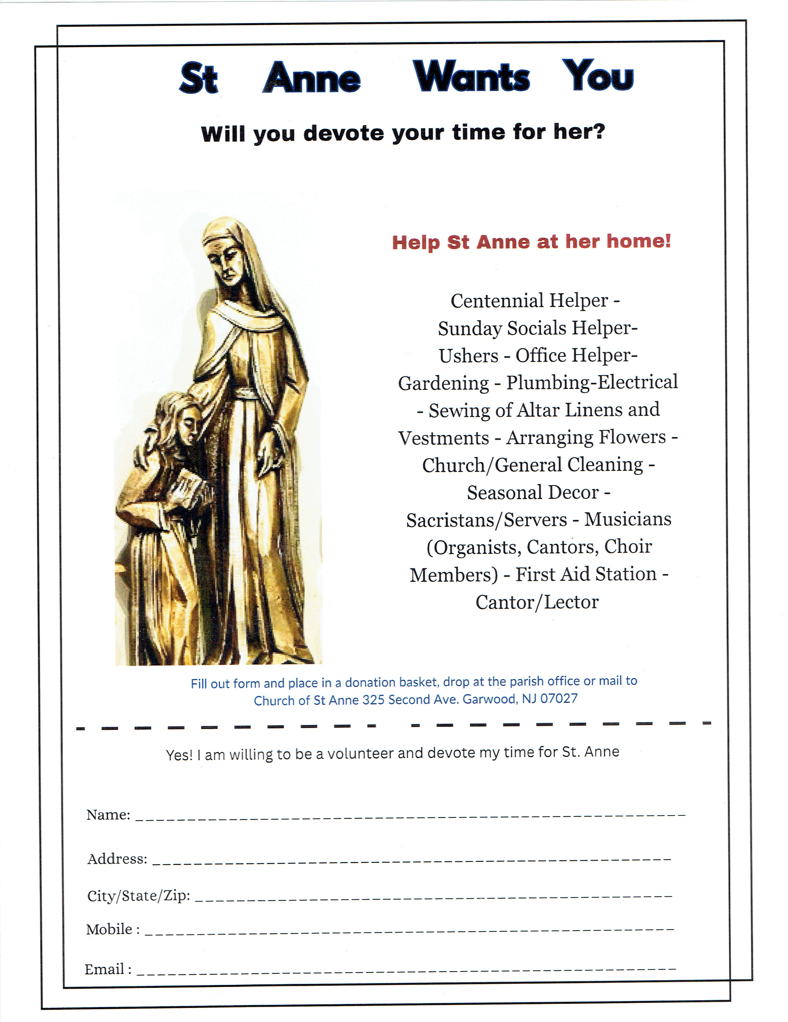The St Anne's Centennial Committee is still requesting and accepting items related to our Church and School from days gone by. Any photos, memorabilia, or artifacts would be greatly appreciated. Our beloved school held numerous pageants, plays, May crownings, and other events that maybe you, your children, or grandchildren partiipated in - we would love to see photos of them! If you don't want to give them up, we can scan/photograh them and give them back to you. Please call the parish office at 908 789 0280 to arrange a time for drop-off. Please include your name and address with the items so we can get them back to you. (One specific item we are looking for is any photos of the bowling lanes that were in the basement of the Church. Everyone remembers them, but no one seems to have a photo). Check your photo albums!